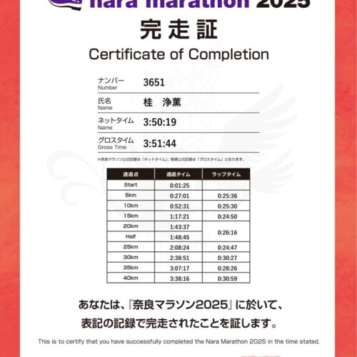 前半は大勢のランナーに囲まれてゆったりペース、でも慌てずマイペースを維持して天理市内へ。そして中間地点を過ぎ、ちょうど3時間で善福寺にほど近い天理高校前(25km地点)まで到達しました。奈良マラソン名物のぜんざいを食べて体を温め、家族の激励も受けて後半戦へ。前半抑えめのペースだったので、後半はこれまでより歩く時間が短く、ある程度走ることができました。