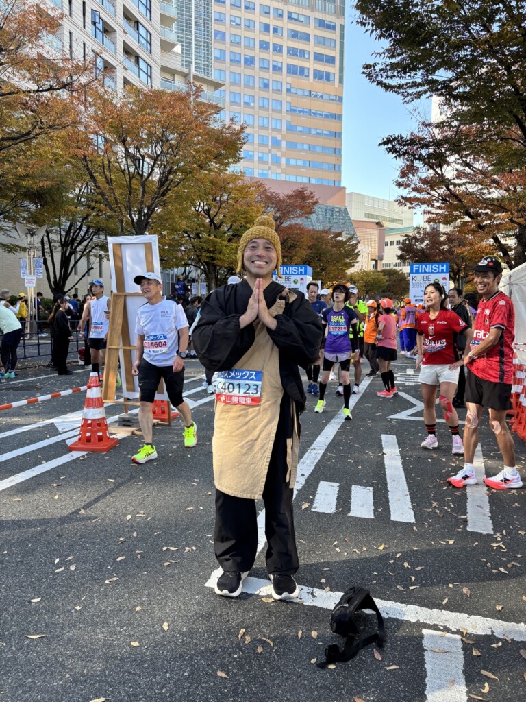 11月16日、2023年以来2年ぶりに神戸マラソンに出場しました。快晴のマラソン日和となり、レース中は暑すぎるほどでした。今回も螺髪ニットに袈裟エプロンで出場しました。
