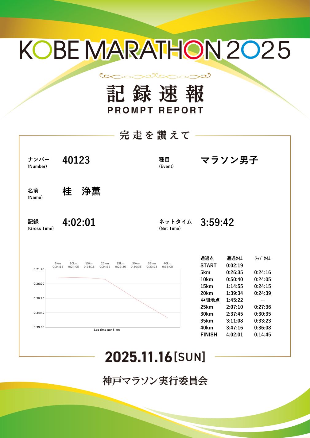 前回はゴール直前に神戸大橋を渡るコースでしたが、今回から神戸ハーバーランドをゴールとする新コース。平坦になって走りやすくなったものの、30kmから大失速してしまいました。前半飛ばしすぎたせいかもしれません。足がつってしまったのが悔しかったです。それでもなんとか4時間以内にゴールできて良かったです。