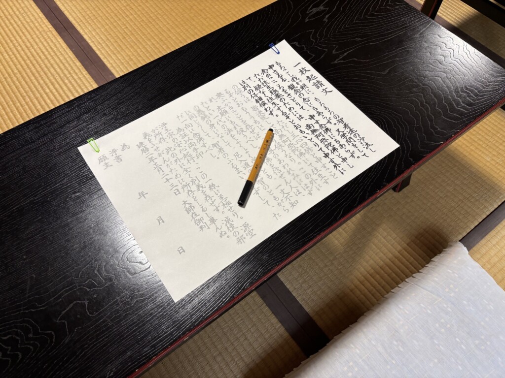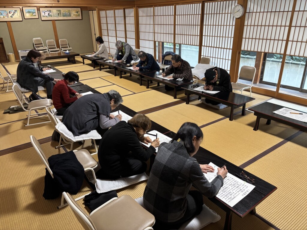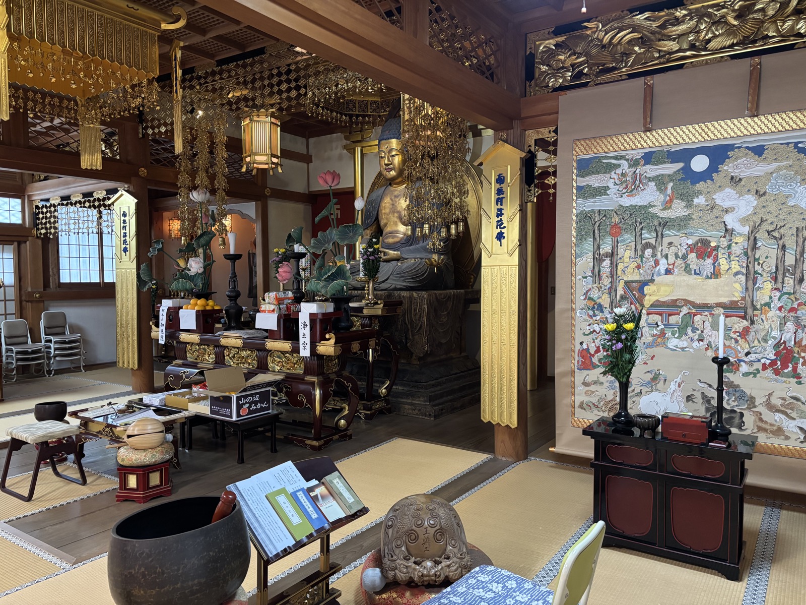 御忌では法然上人年忌にちなんで一枚起請文を写経するのが恒例です。皆さん来寺間もなく集中して書き始められました。書き上げた写経を仏前にお供えして御忌を勤めるのと同時に、善福寺蔵300年前の涅槃図のもとお釈迦さまのご回向も勤めました。
