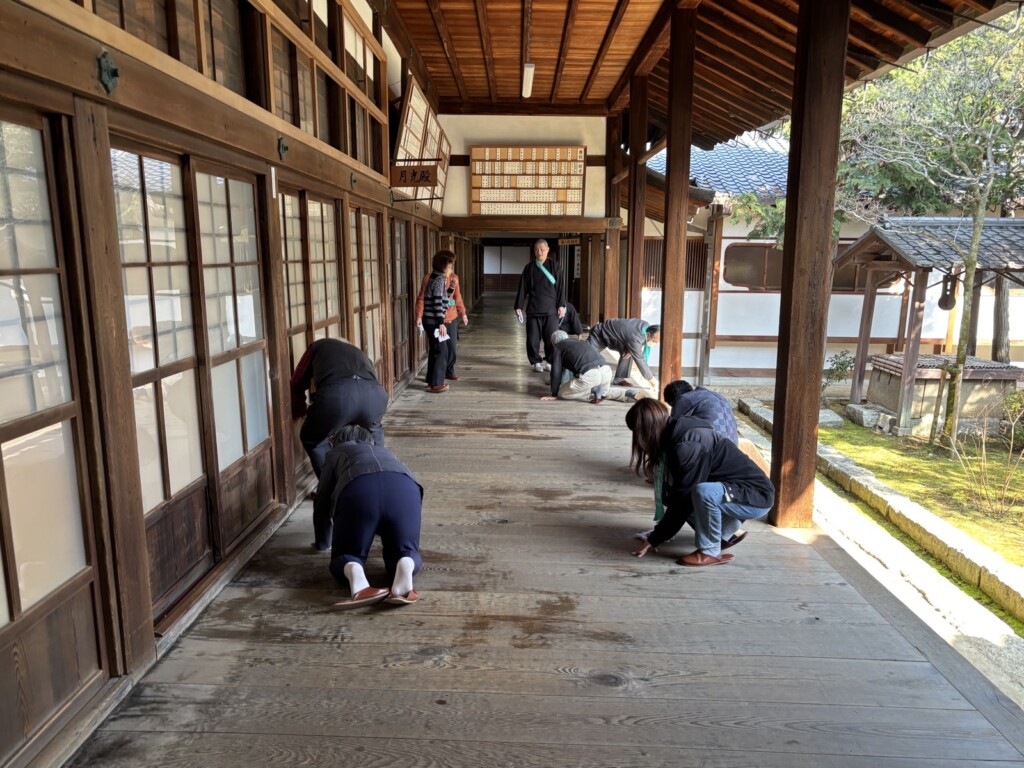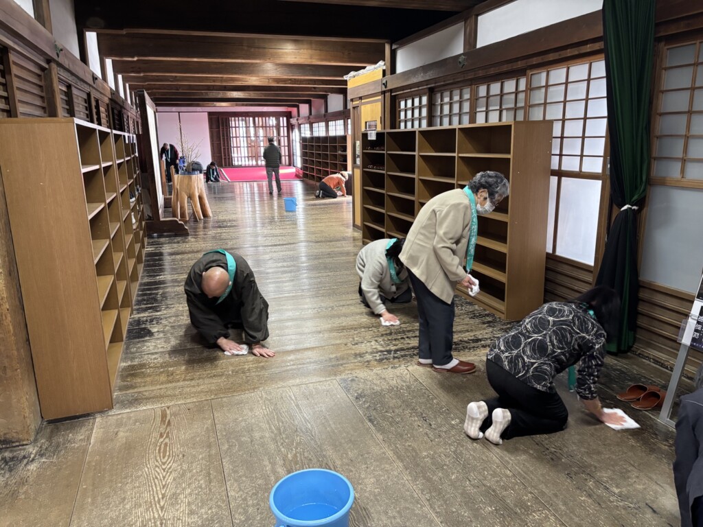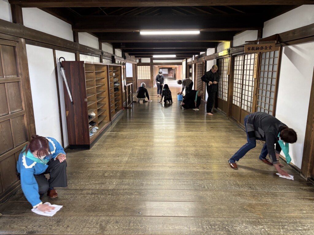 食堂で昼食を頂いた後、礼拝と別時念仏、法話を拝聴しました。そして掃除の奉仕活動。翌日に結婚式があるということで、長い廊下を雑巾で拭き掃除しました。最後に解団式を行い、土産物を買って、バスで帰路につきました。